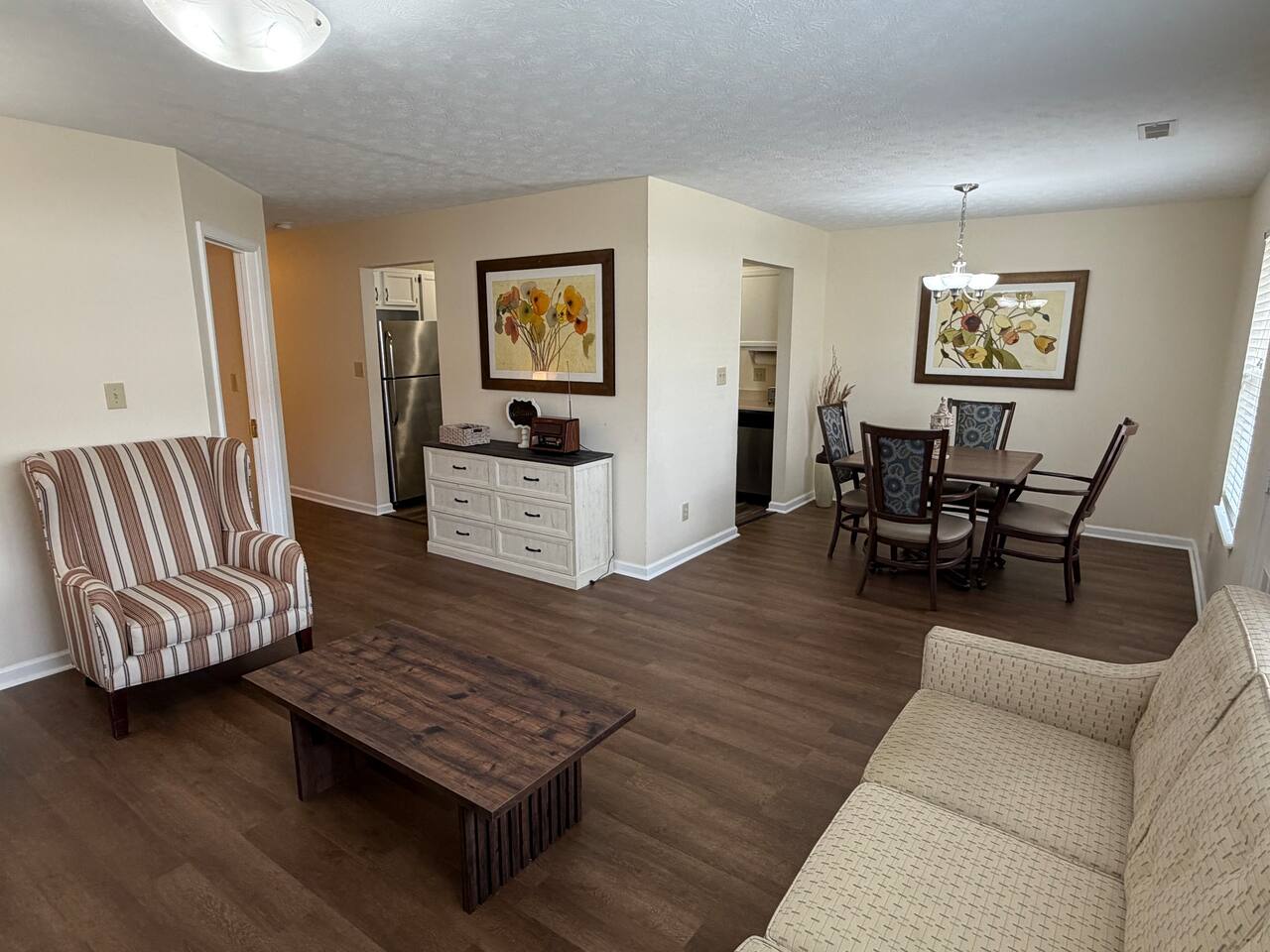 Spacious 2BR/1BA townhome in a quiet, tucked-away setting near Keystone & Castleton. Features 2 queen beds, sunroom with workspace/dining area, full kitchen, Smart TVs, and in-unit washer/dryer. Enjoy a private patio and free driveway parking right at your door. Peaceful and private, yet minutes to top shopping, restaurants, and everything Indianapolis has to offer. Perfect for business, families, or extended stays.
