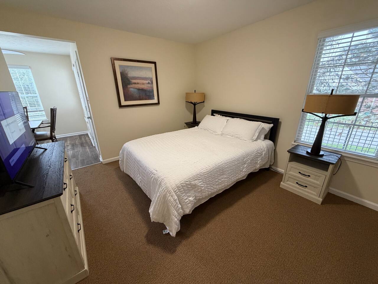 Tucked away in a peaceful and private setting, this spacious 2-bedroom, 2-bath townhome offers the perfect blend of comfort, convenience, and quiet—just minutes from everything Indianapolis has to offer. Each bedroom features a comfortable queen bed, with two full bathrooms providing plenty of space and privacy for guests. The home includes a bright sunroom with a dedicated workspace, dining table, and card/game area—ideal for remote work or relaxing evenings in. Enjoy a fully equipped kitchen, Smart TVs, and the convenience of an in-unit washer and dryer. Step outside to your own private patio with table and chairs, perfect for morning coffee or unwinding at night. Parking is effortless with a free private driveway directly in front of the home—no searching, no hassle. While the setting is quiet and secluded, you’re just minutes from: Keystone Fashion Mall Castleton Square Mall Top restaurants, shopping, and grocery options Whether you're in town for business, a family visit, or an extended stay, this home offers a peaceful alternative to hotels with unbeatable access to the city.