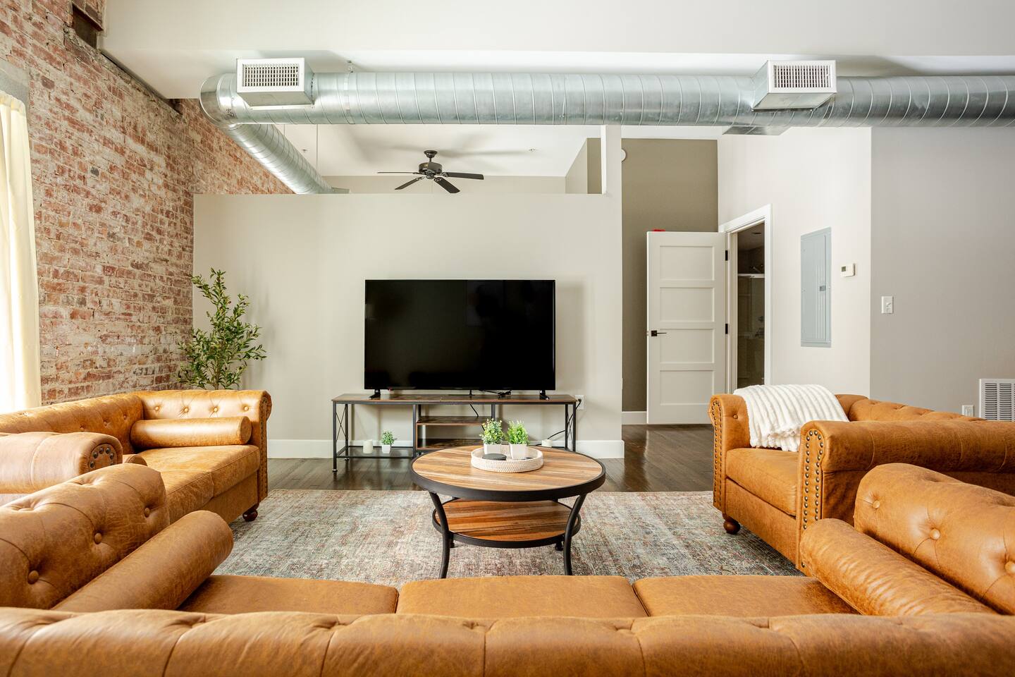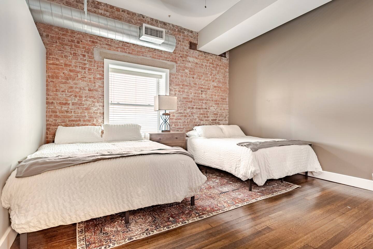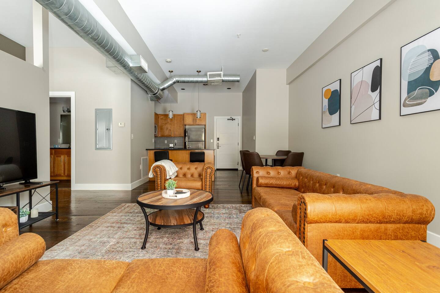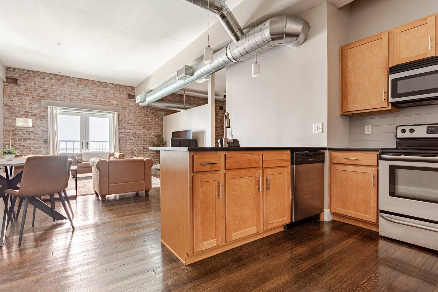 Step into an exceptionally spacious open-plan apartment where modern design meets comfort. High ceilings with exposed ductwork, rich hardwood floors, and accent brick walls create a stylish, urban atmosphere. You can relax in the large living room on one of two plush tan leather couches or the matching lounge chair while enjoying the 65-inch TV. The living area flows into a full kitchen, equipped with stainless steel appliances, where you can prepare meals. Enjoy them at the dining table or casually at the countertop bar. The sleeping area features two comfortable queen beds, set against a beautiful exposed brick wall. Freshen up in the modern bathroom, which includes a walk-in shower with two shower heads for a relaxing, spa-like experience. For your convenience, a washer and dryer are located inside the unit.
