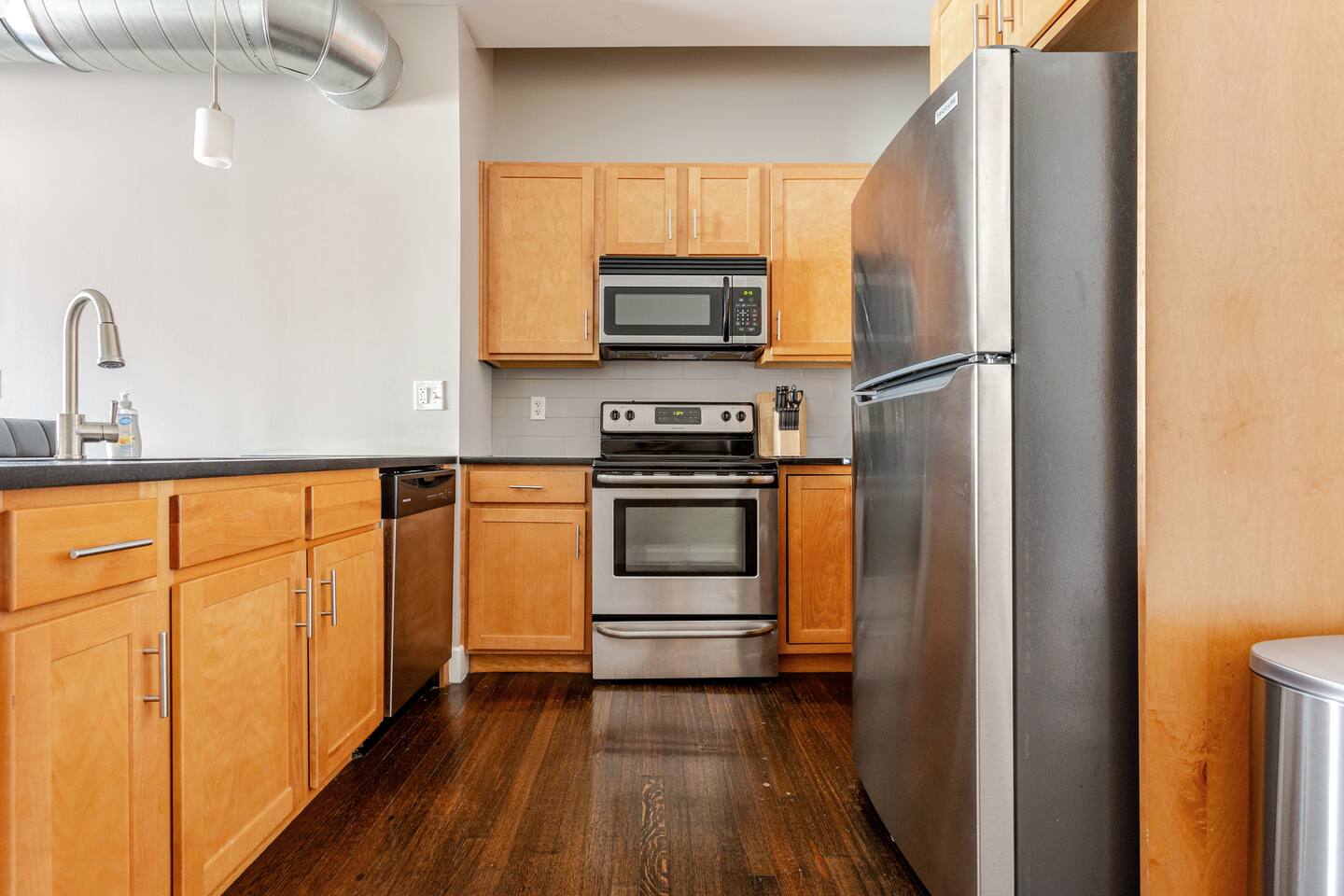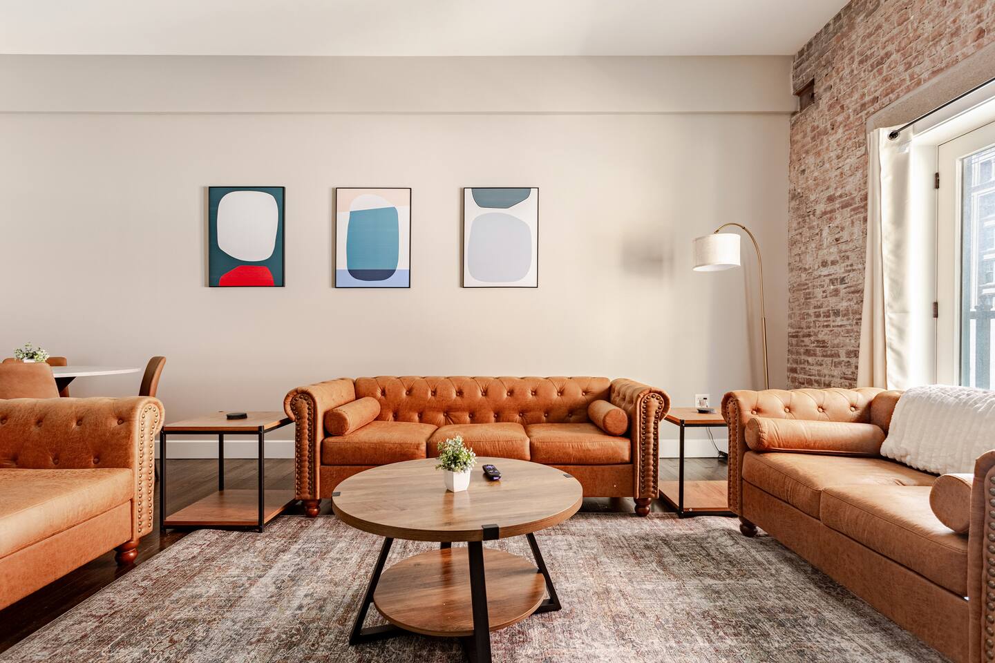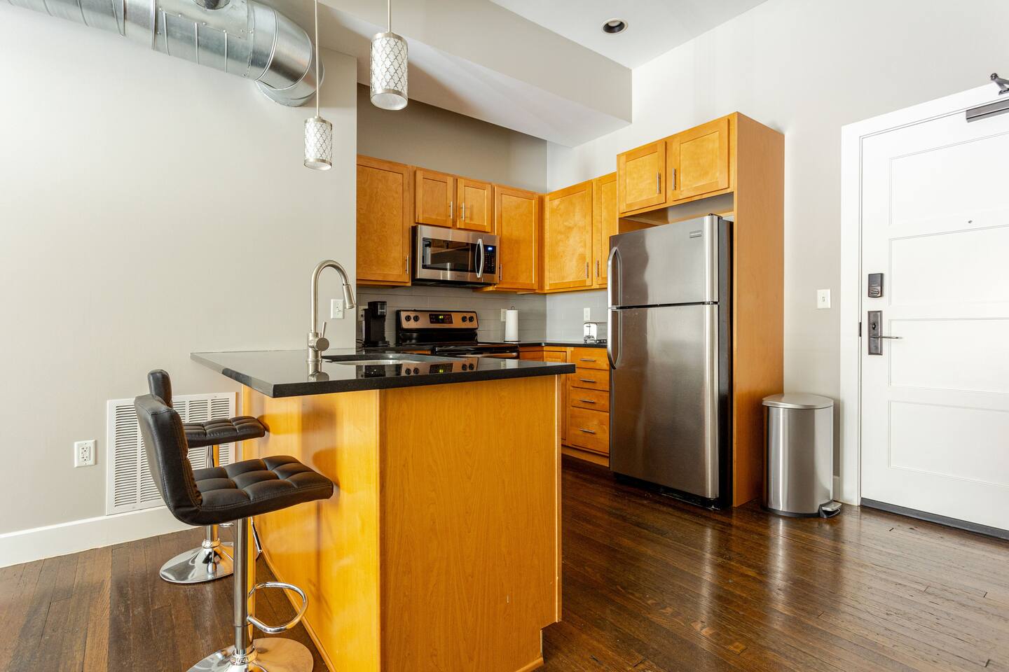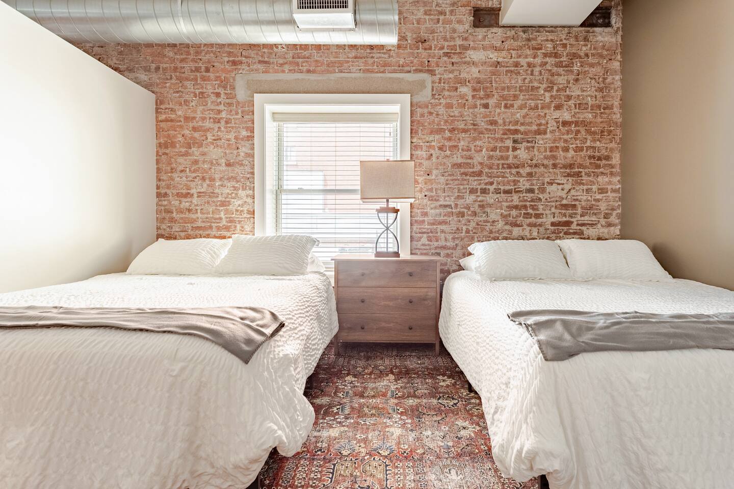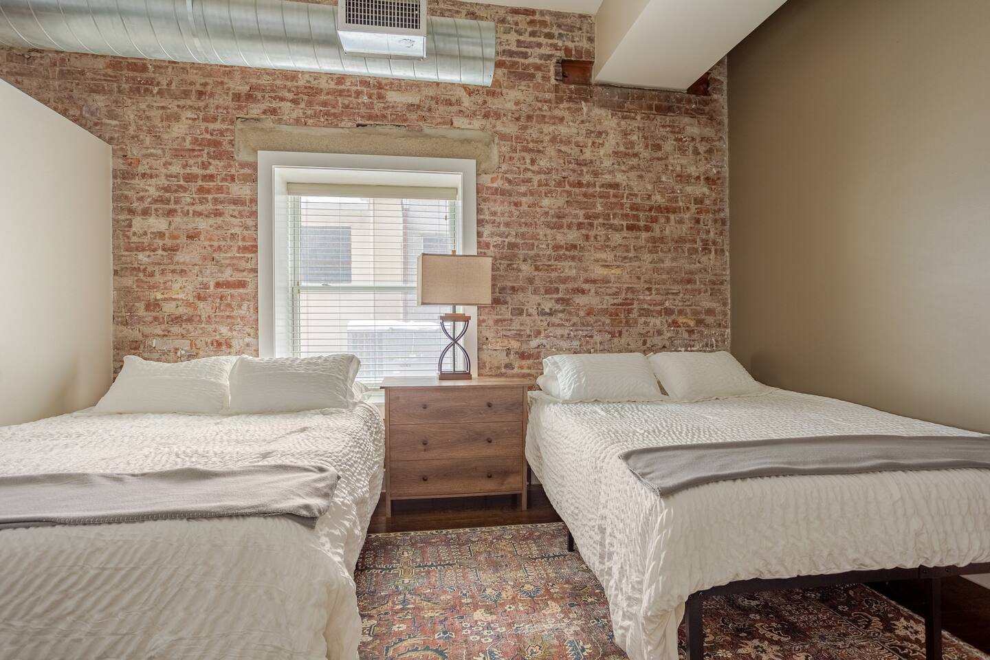 Step into an exceptionally spacious open-plan apartment where modern design meets comfort. High ceilings with exposed ductwork, rich hardwood floors, and accent brick walls create a stylish, urban atmosphere. You can relax in the large living room on one of two plush tan leather couches or the matching lounge chair while enjoying the 65-inch TV. The living area flows into a full kitchen, equipped with stainless steel appliances, where you can prepare meals. Enjoy them at the dining table or casually at the countertop bar. The sleeping area features two comfortable queen beds, set against a beautiful exposed brick wall. Freshen up in the modern bathroom, which includes a walk-in shower with two shower heads for a relaxing, spa-like experience. For your convenience, a washer and dryer are located inside the unit.