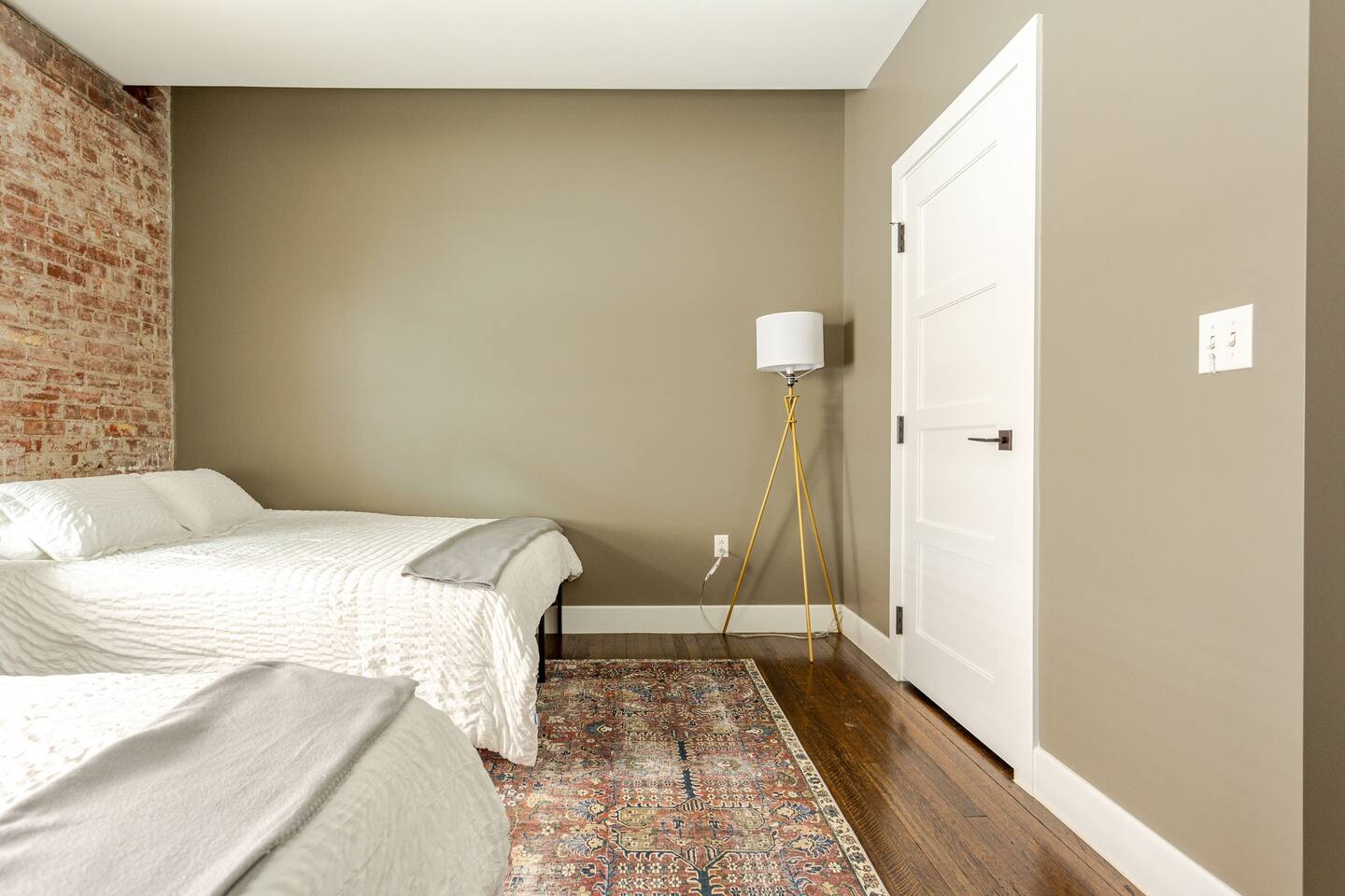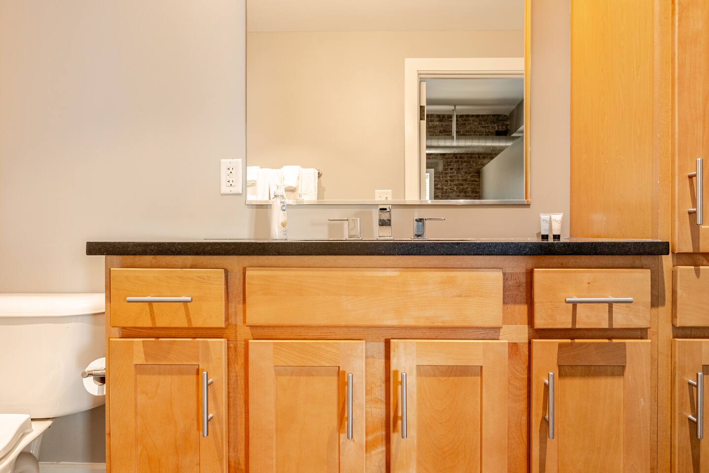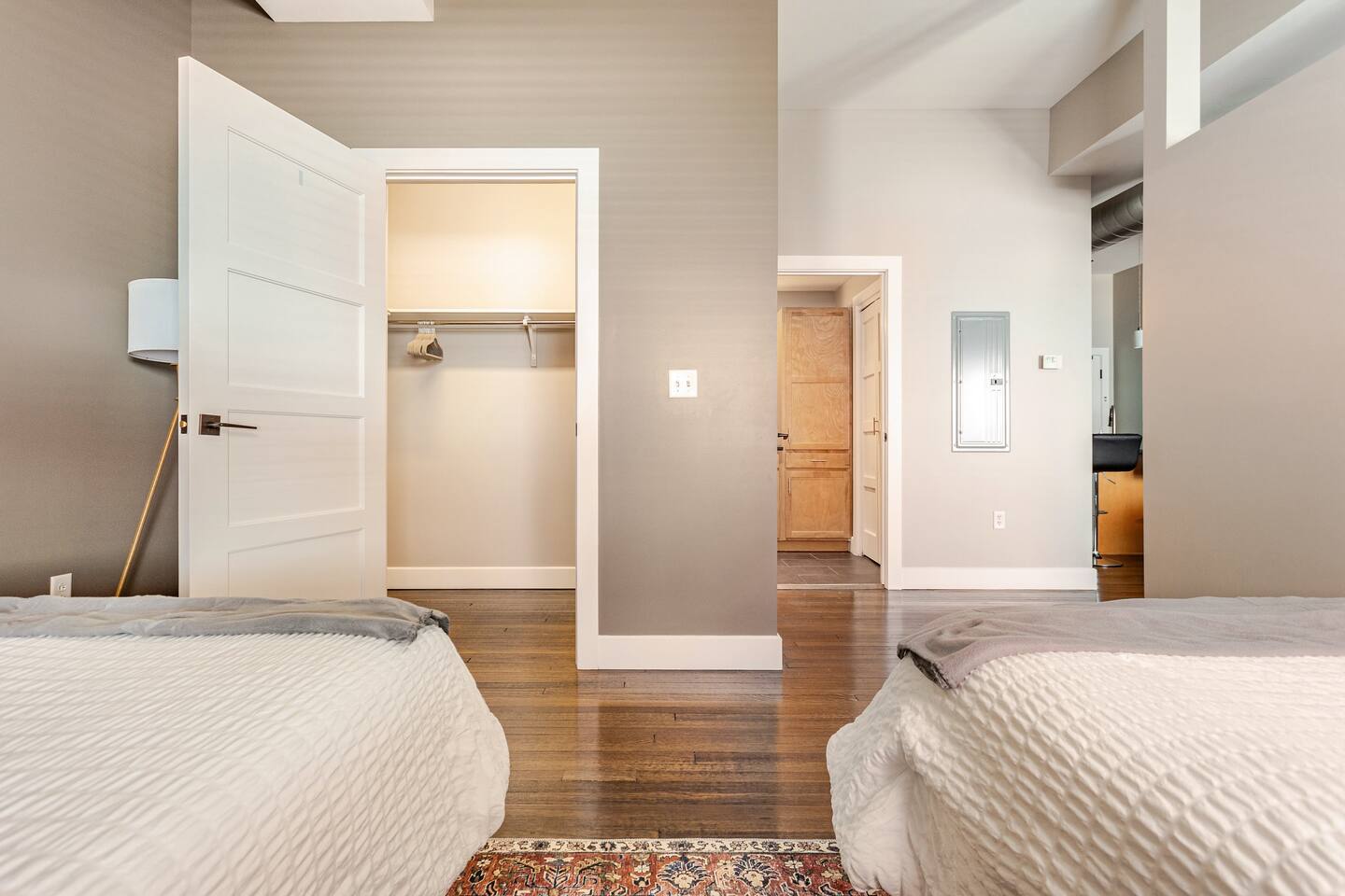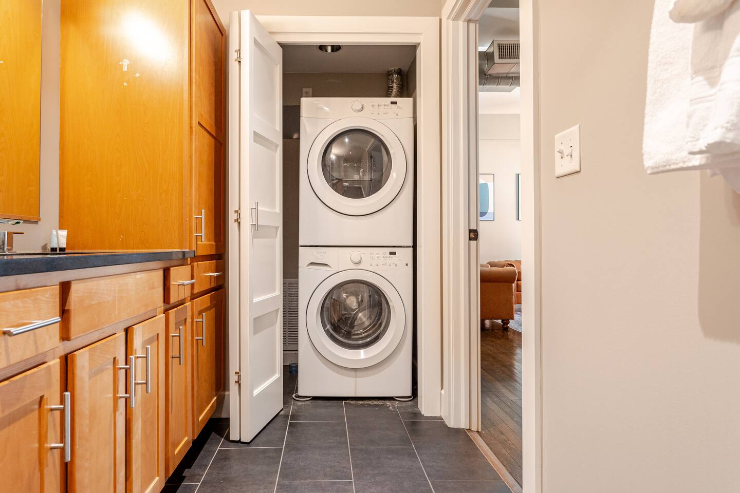 Step into an exceptionally spacious open-plan apartment where modern design meets comfort. High ceilings with exposed ductwork, rich hardwood floors, and accent brick walls create a stylish, urban atmosphere. You can relax in the large living room on one of two plush tan leather couches or the matching lounge chair while enjoying the 65-inch TV. The living area flows into a full kitchen, equipped with stainless steel appliances, where you can prepare meals. Enjoy them at the dining table or casually at the countertop bar. The sleeping area features two comfortable queen beds, set against a beautiful exposed brick wall. Freshen up in the modern bathroom, which includes a walk-in shower with two shower heads for a relaxing, spa-like experience. For your convenience, a washer and dryer are located inside the unit.