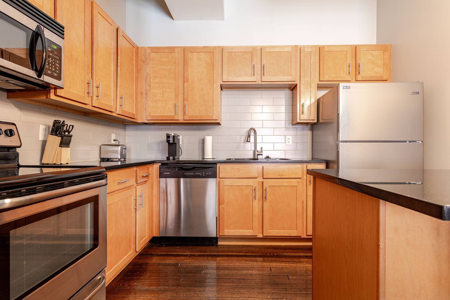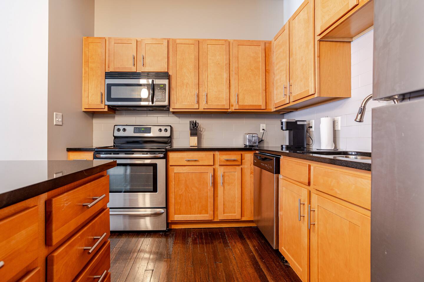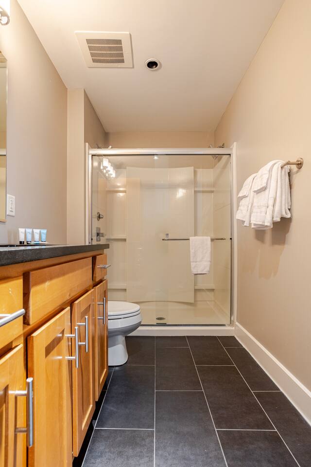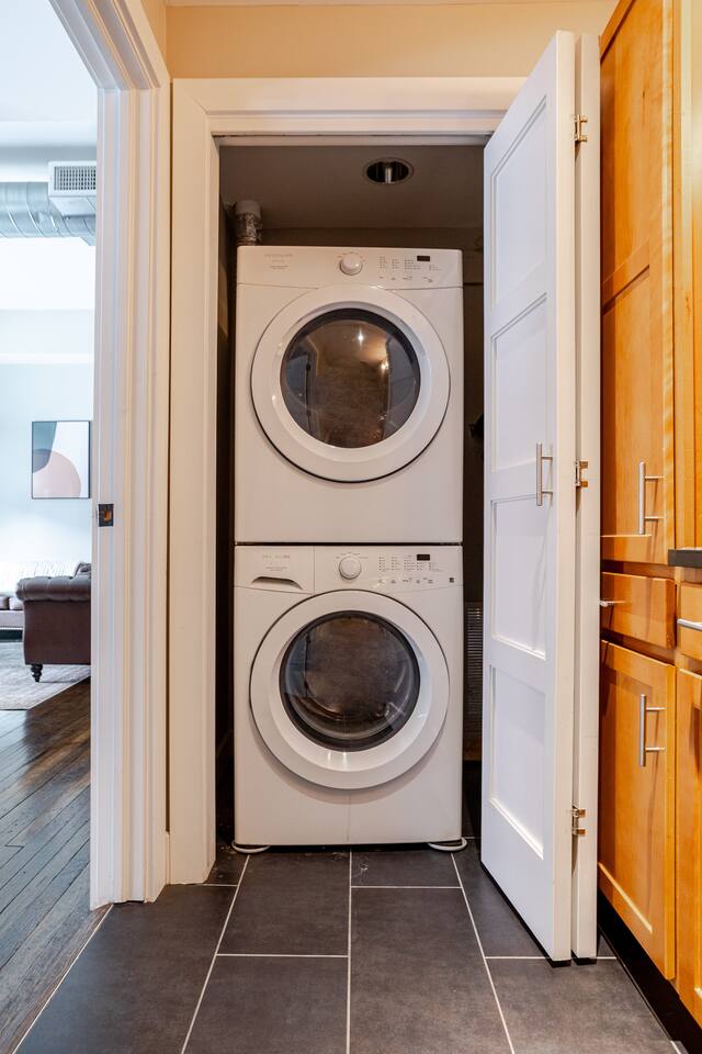 The open-plan living area is designed for both comfort and convenience, whether you're visiting for business, leisure, or a special event. The apartment includes one bedroom, one bathroom, a large living room, and a full kitchen, equipped with everything you need to feel right at home. Bedroom: Features two comfortable queen beds. Living Room: Unwind with a 65'' TV, two couches, and a lounge chair. Kitchen & Dining: A full kitchen with a countertop bar and stools, plus a separate dining table. Bathroom: Enjoy a relaxing experience in the shower with two shower heads. Convenience: A washer and dryer are provided in the unit for your use. Our central location provides the ideal base to explore everything the city has to offer.