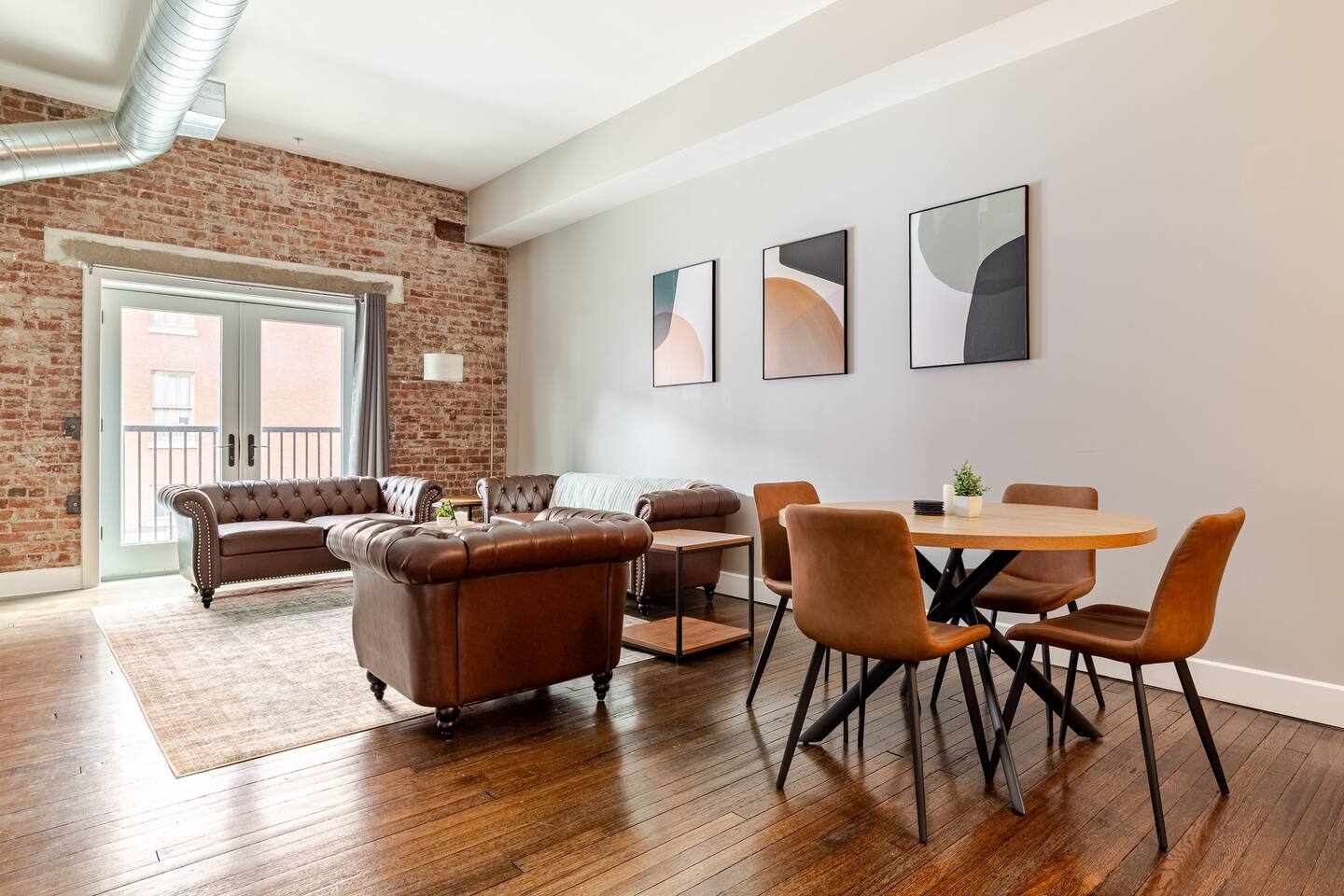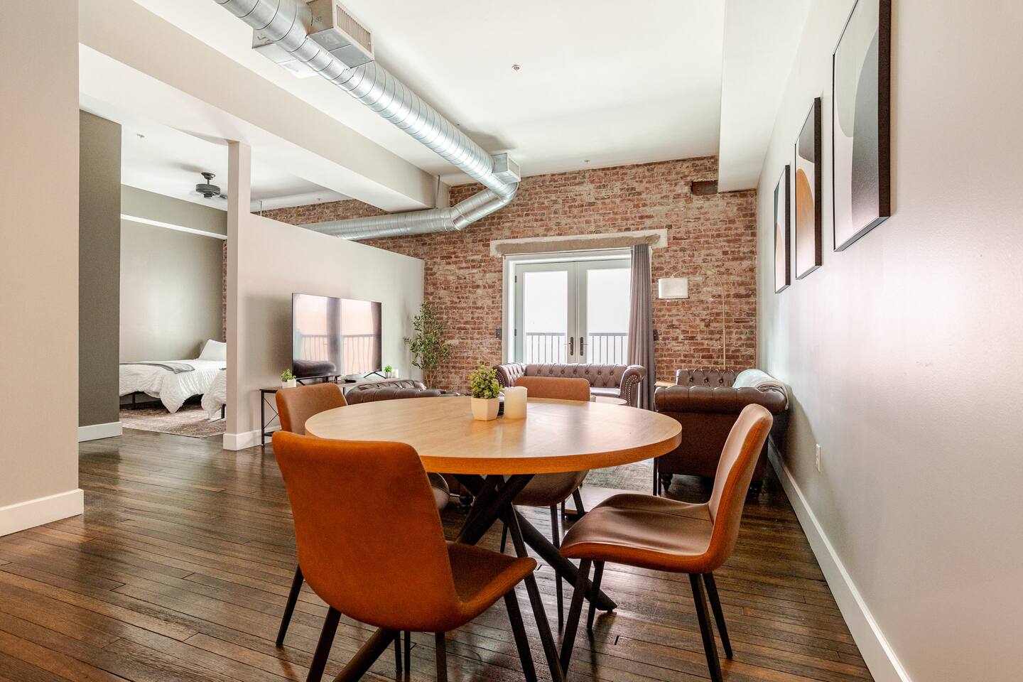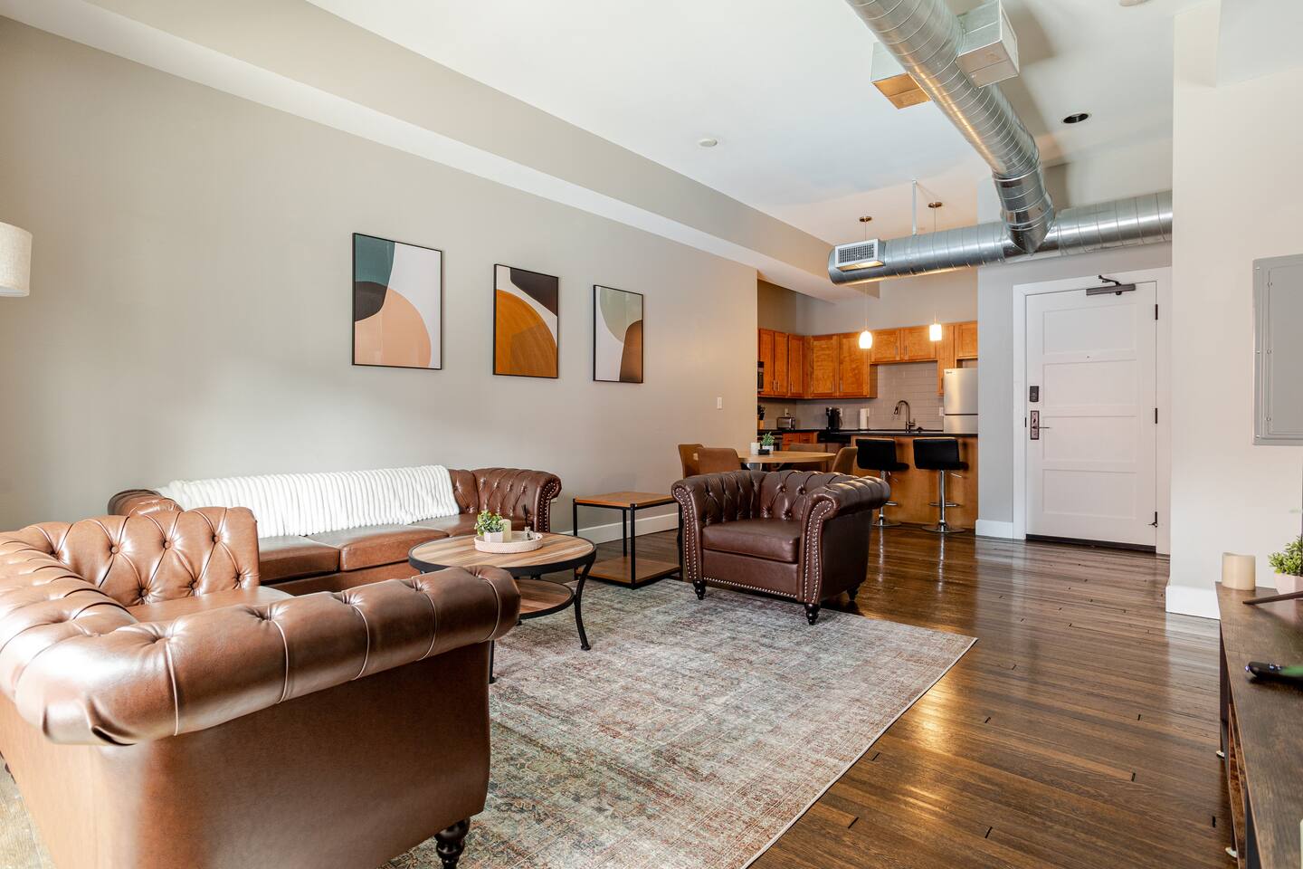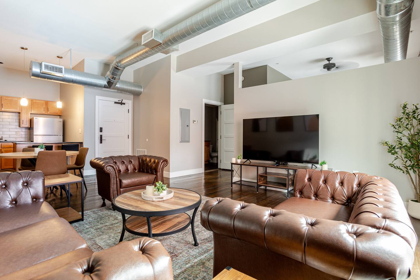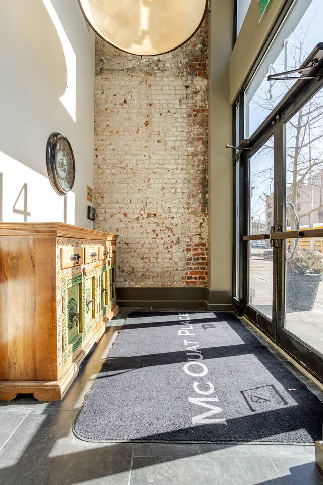 Welcome to McOuat Place, your stylish urban loft in the heart of downtown Indianapolis. Step into an exceptionally spacious apartment where modern design meets classic comfort. Exposed brick walls and comfortable leather sofas create a warm, inviting atmosphere perfect for relaxing after a day of exploring the city. You are perfectly positioned to experience the best of Indy. Located in the heart of downtown, you are just steps away from the city's top attractions, dining, and entertainment.