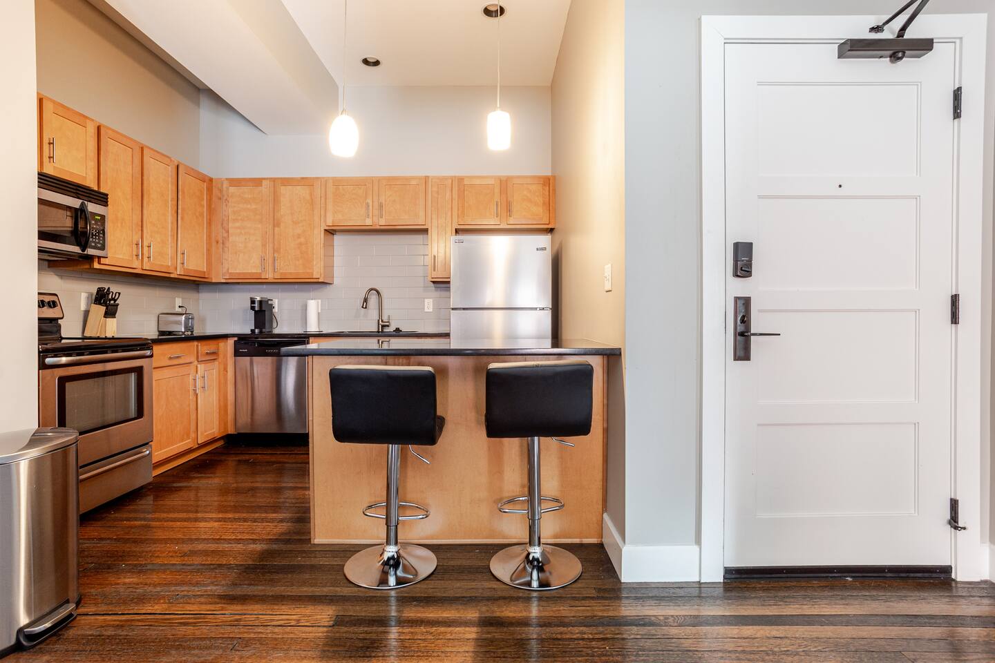 Enjoy seamless and secure entry throughout your stay. You will receive a unique digital code that grants you private access to the main lobby, the elevator to your floor, and your apartment. No need to worry about carrying or losing keys!