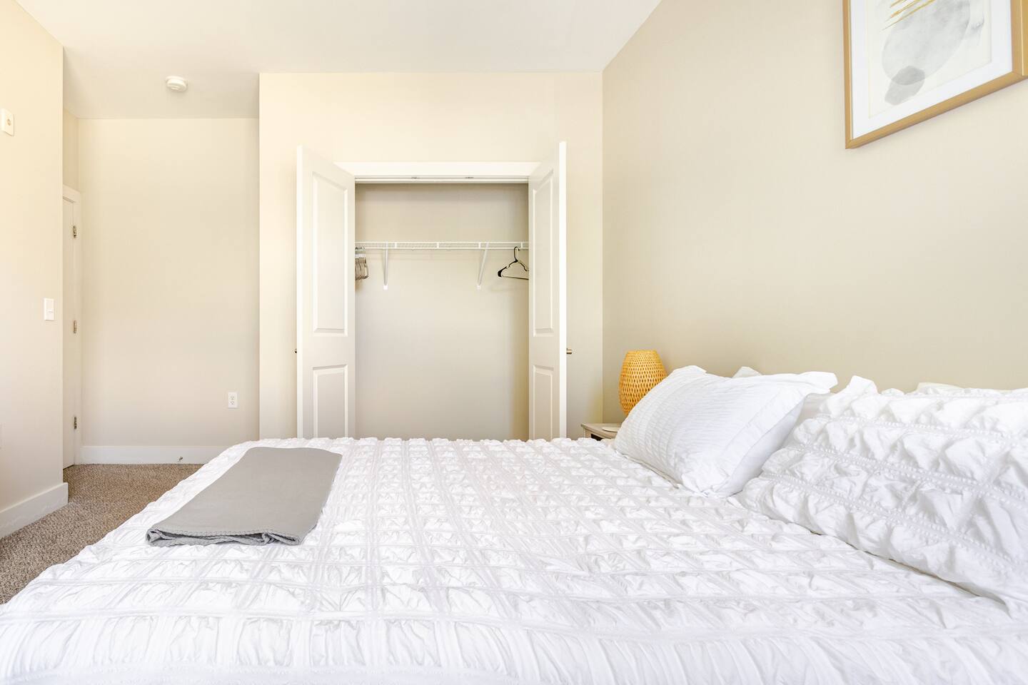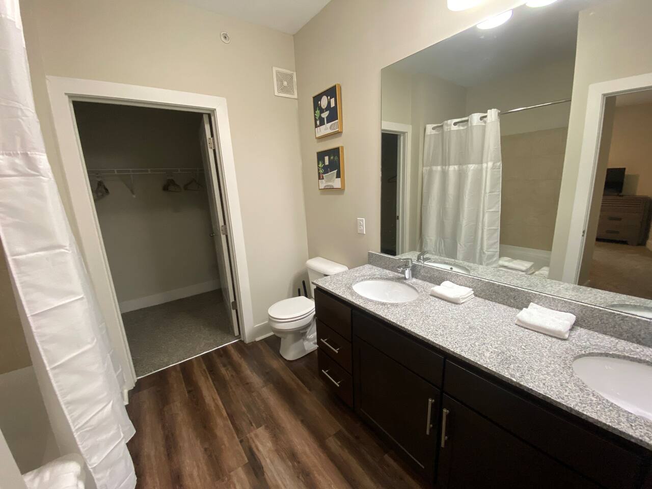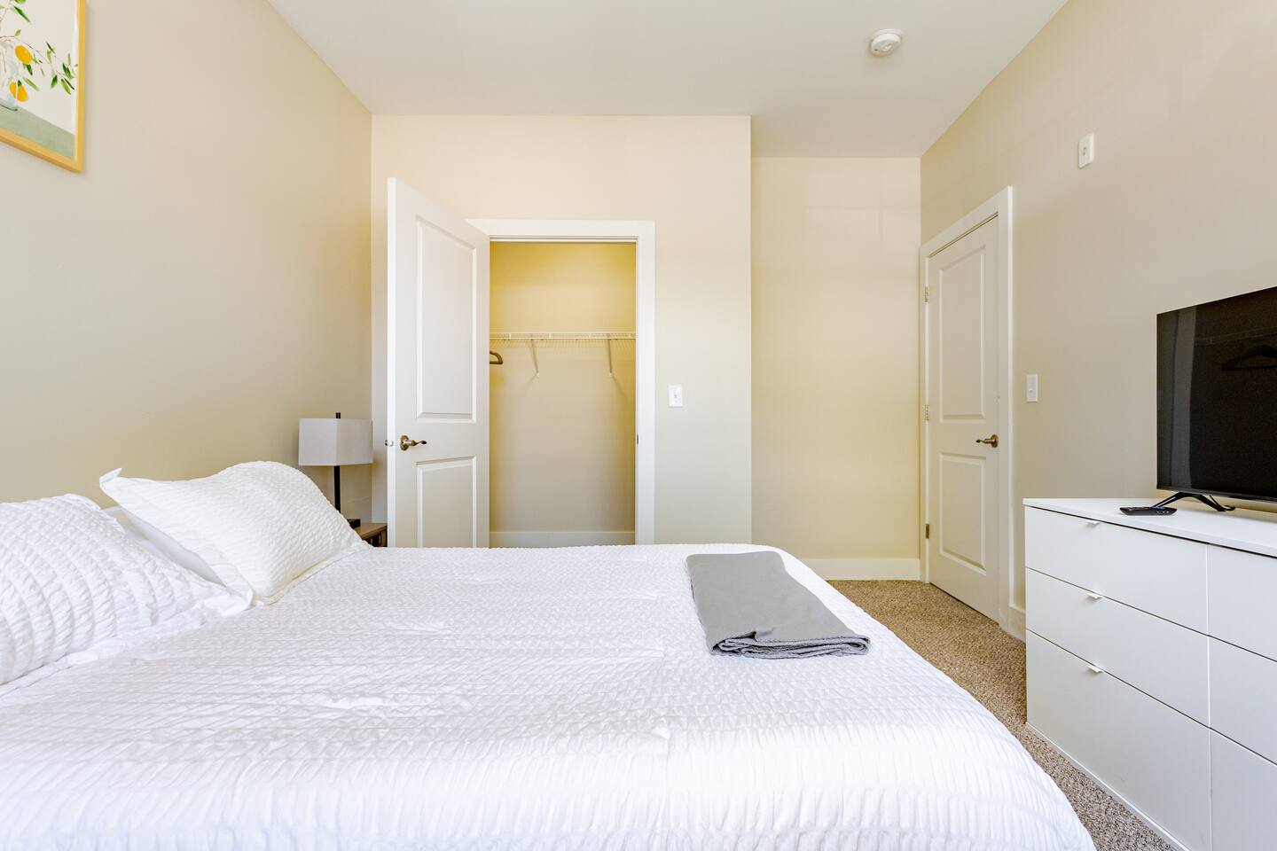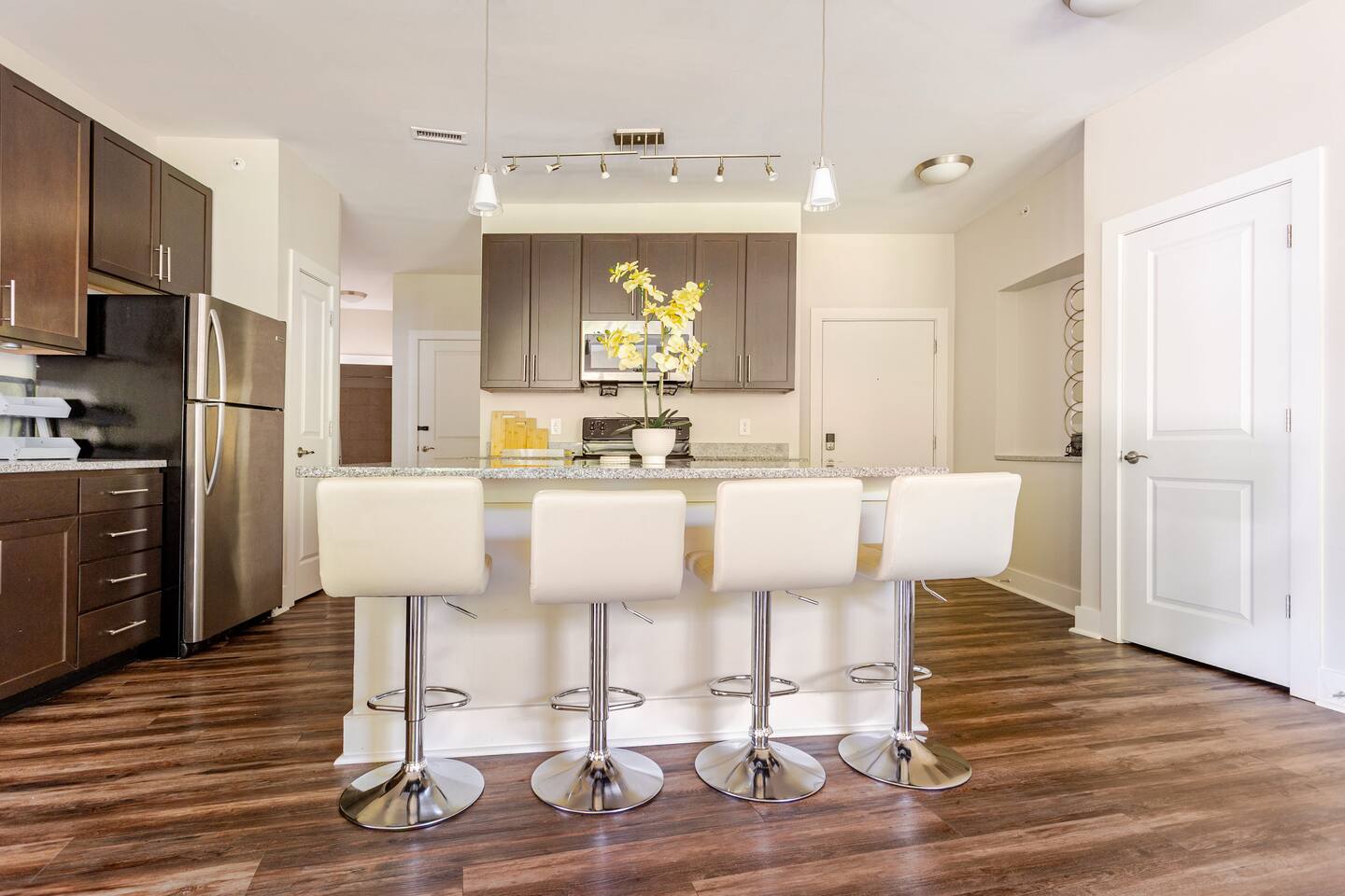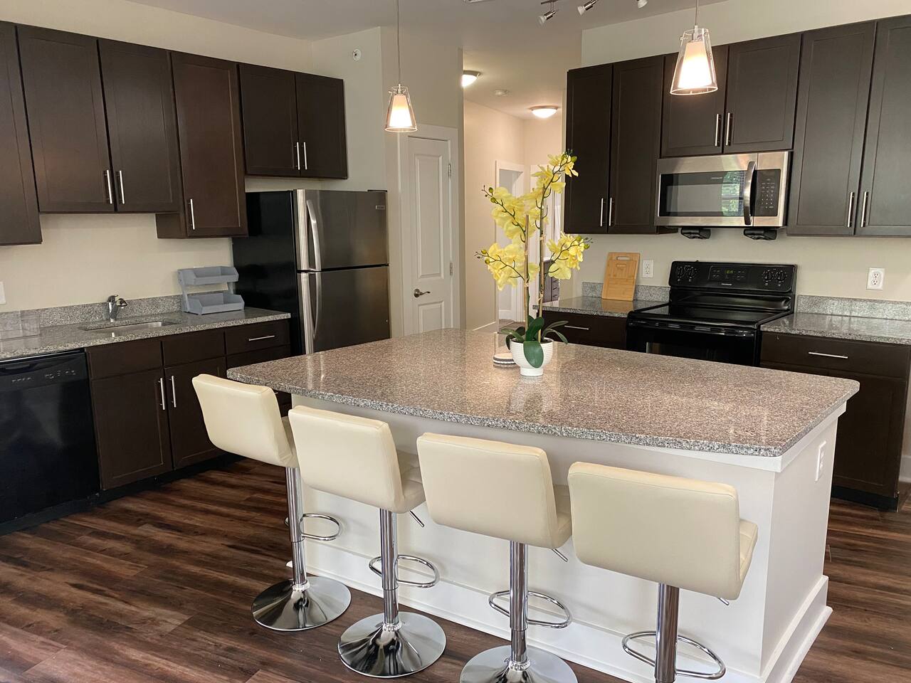 Your private apartment is a spacious and modern retreat designed for relaxation and convenience. The open-plan living area connects seamlessly to a full kitchen, creating a welcoming environment for everyone to gather. Key Features: - 3 stylish bedrooms, each equipped with a smart TV - 2 full bathrooms - 2 large walk-in closets and 1 standard closet - Fully equipped kitchen with a large island and 4 bar stools - Dining table with seating for 6 - In-unit washer and dryer - A private patio for your enjoyment