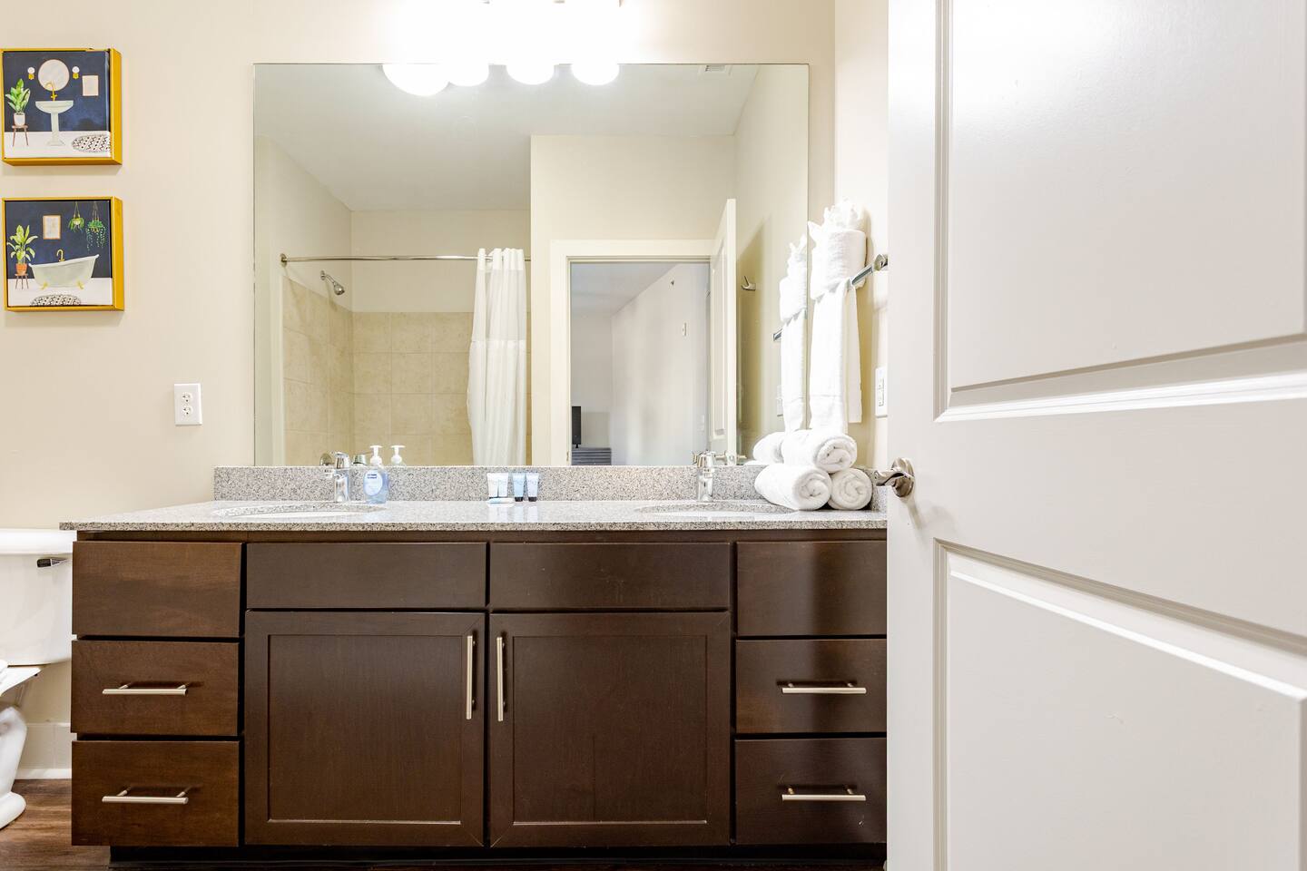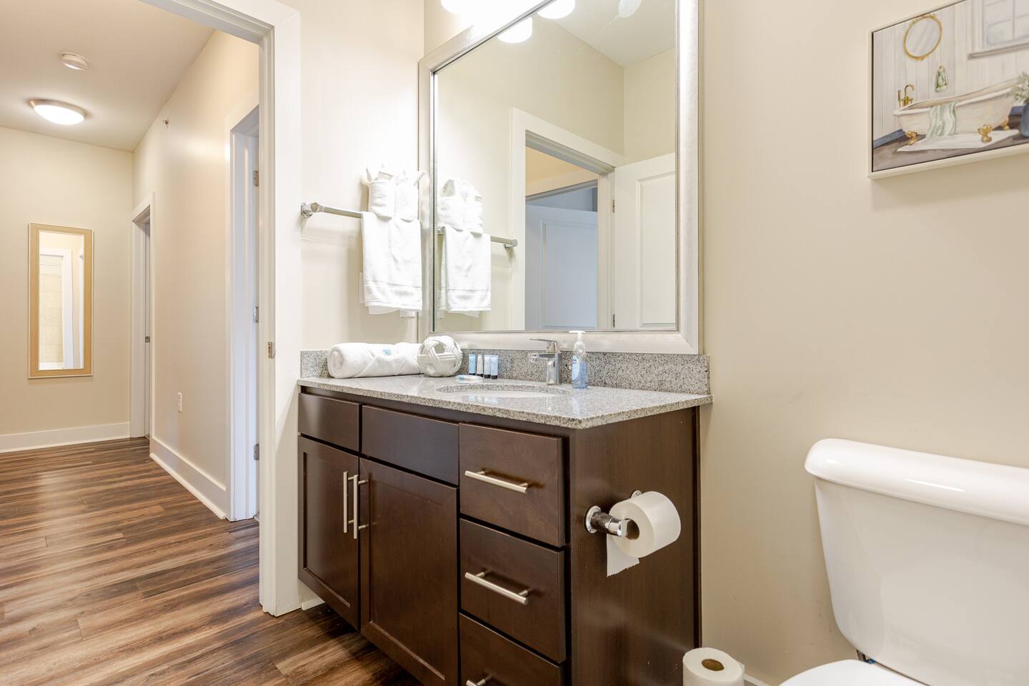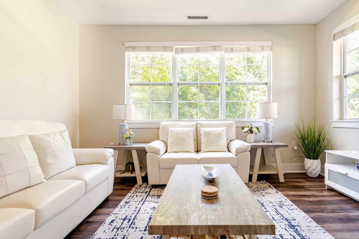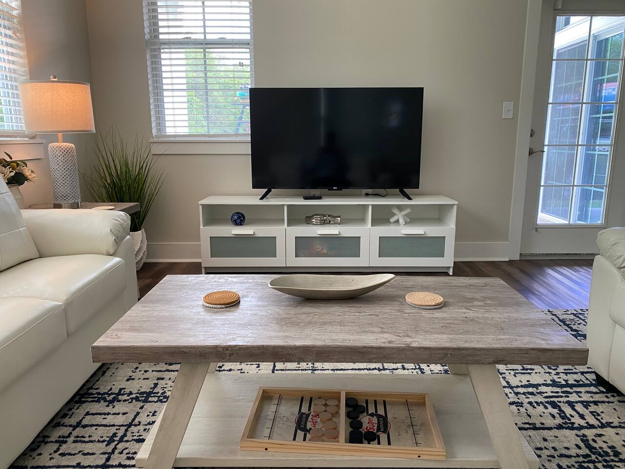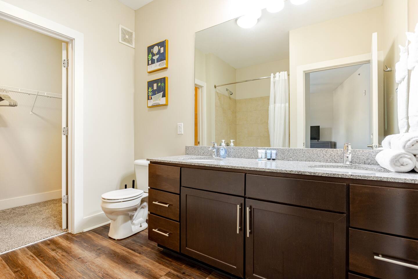 Your private apartment is a spacious and modern retreat designed for relaxation and convenience. The open-plan living area connects seamlessly to a full kitchen, creating a welcoming environment for everyone to gather. Key Features: - 3 stylish bedrooms, each equipped with a smart TV - 2 full bathrooms - 2 large walk-in closets and 1 standard closet - Fully equipped kitchen with a large island and 4 bar stools - Dining table with seating for 6 - In-unit washer and dryer - A private patio for your enjoyment