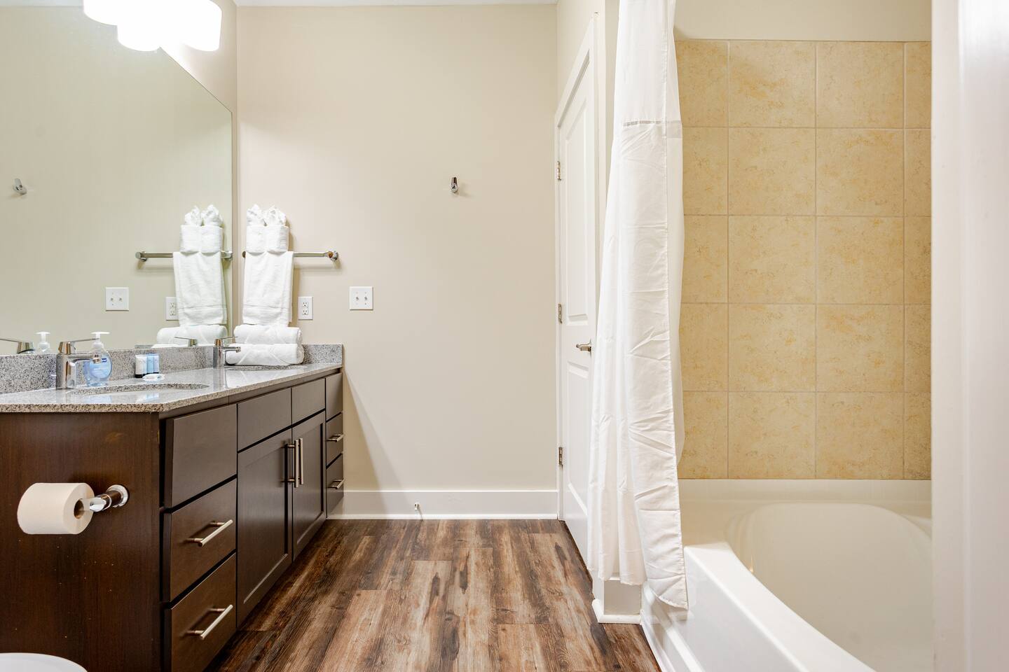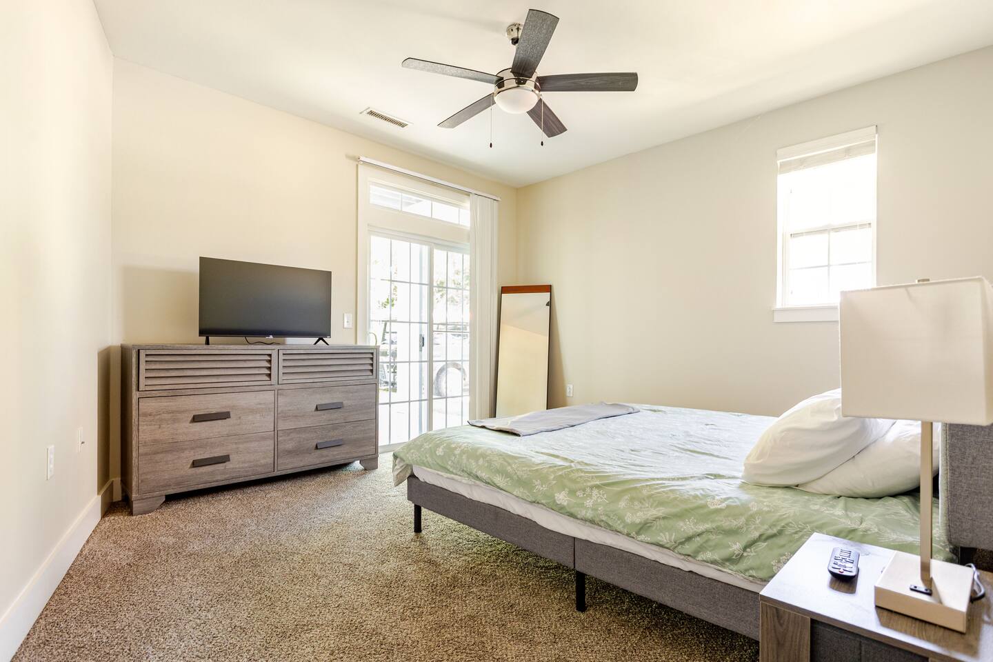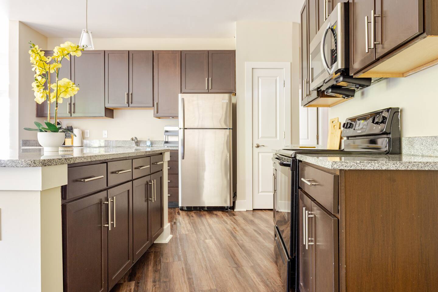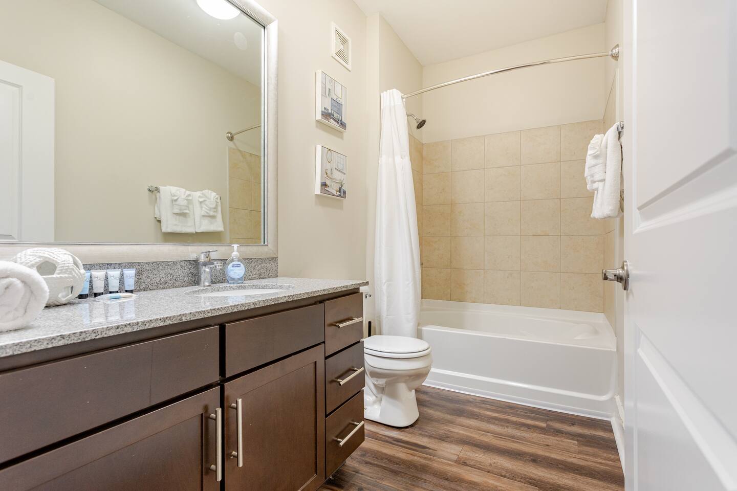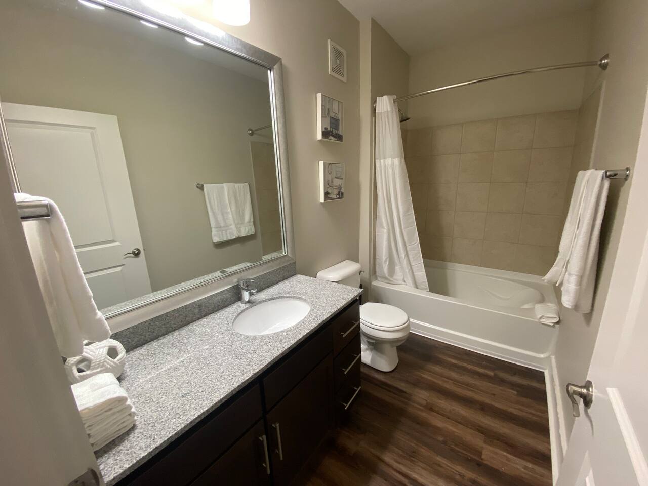 Your private apartment is a spacious and modern retreat designed for relaxation and convenience. The open-plan living area connects seamlessly to a full kitchen, creating a welcoming environment for everyone to gather. Key Features: - 3 stylish bedrooms, each equipped with a smart TV - 2 full bathrooms - 2 large walk-in closets and 1 standard closet - Fully equipped kitchen with a large island and 4 bar stools - Dining table with seating for 6 - In-unit washer and dryer - A private patio for your enjoyment